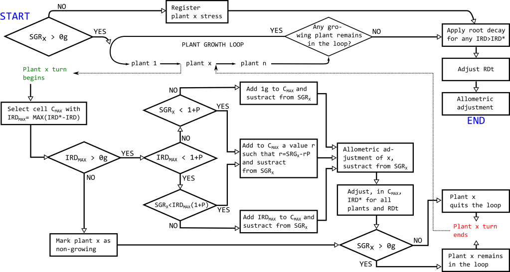 During the PGL each plant will be allowed to grow a limited biomass of fine roots per loop turn (set to 1 gram as an example in Fig 1 and hereafter, but can be adjusted also depending on the time scale decided for each time step) in one grid cell. In every plant turn, first, the cell in which the plant will grow roots, CMAX, will be selected as the grid cell where the difference between current fine root biomass and optimal biomass is maximal (this difference is noted as IRDMAX) among the already occupied cells, or juxtaposed cells hence expanding its root range. During the plant turn, only changes in the cell CMAX will be performed. Second, the amount of biomass allocated into roots in CMAX is determined. If IRDMAX is negative, this means that the plant has reached or surpassed its optimal root growth: Then the plant will be marked as non-growing for this loop run, but the plant will remain in the loop because it may find eventually beneficial to grow some roots as a response to other plant roots’ proliferation. If IRDMAX is positive, this means that there is at least one grid cell where the plants benefits from root proliferation according to the ESPR. In this case, an amount r of biomass will be added to the value of IRD in CMAX, accounting for the proportional amount of biomass P necessary to fulfill the allometric growth of coarse roots and shoot. If SGrX constrains growth (is lower than what the plant would grow according to IRDMAX), all the SGrX will be allocated to growth and the plant will eventually quit the loop (SGRX will become 0). If growth is not constrained by SGrX, the plant will grow its IRD in CMAX a maximum amount of 1g (for example) of biomass, but if IRDMAX is lower than this value then it will grow IRDMAX. After fine root proliferation, and before ending the plant’s turn in the loop, r.P biomass will be allocated to coarse roots and to shoot and subtracted from SGrX, and IRD for each plant and RDt will be updated in CMAX. In each loop run all plants will go thru this process. By the end on a loop run the plants state will be evaluated, and if all plants in the loop are marked as non-growing the loop ends, otherwise it will run again.