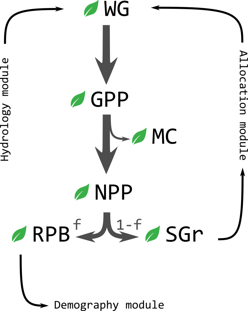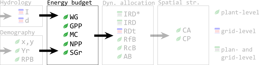 The dynamic allocation module requires an initial biomass available for somatic growth for each plant (SGr) at the beginning of each time step: The energy budget model (Fig 1) will provide such value. Plant net water gain will be calculated in the first place using hydrology and allocation variables’ values following the ESPR equations (Cabal et al. 2020), and then transformed into a gross primary productivity based on plants’ water use efficiency. Subtracting maintenance costs of existing biomass respiration and turnover, we obtain the net primary productivity, which is the new biomass that can be allocated into reproduction (fecundity, f, is the fraction allocated into reproduction) or somatic growth (the remaining 1-f).